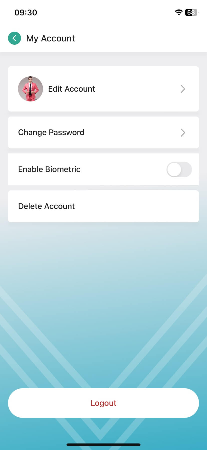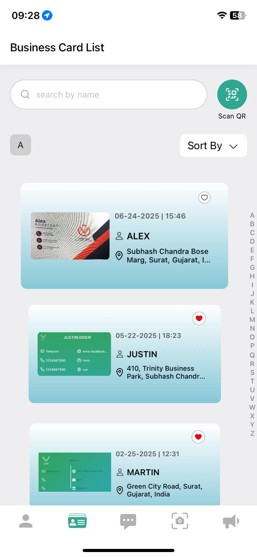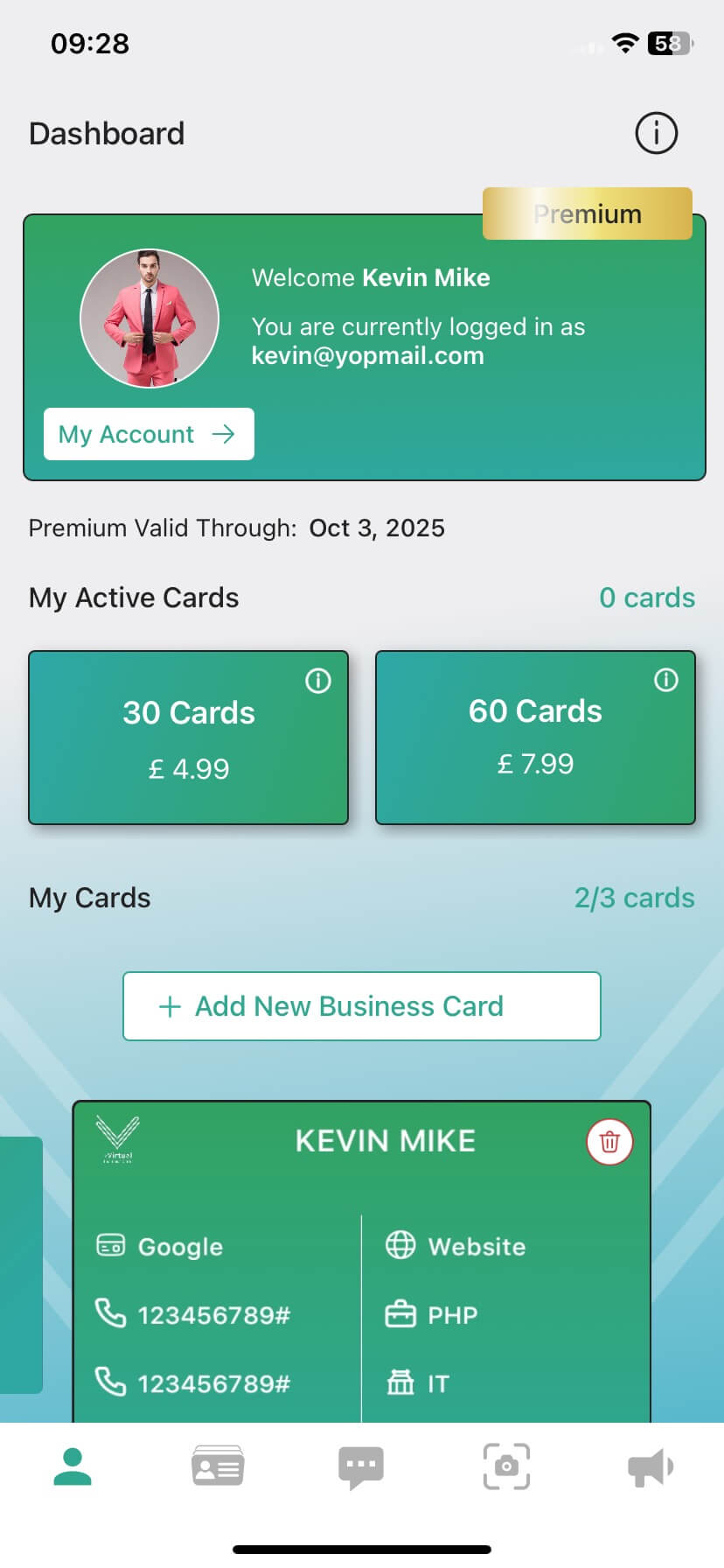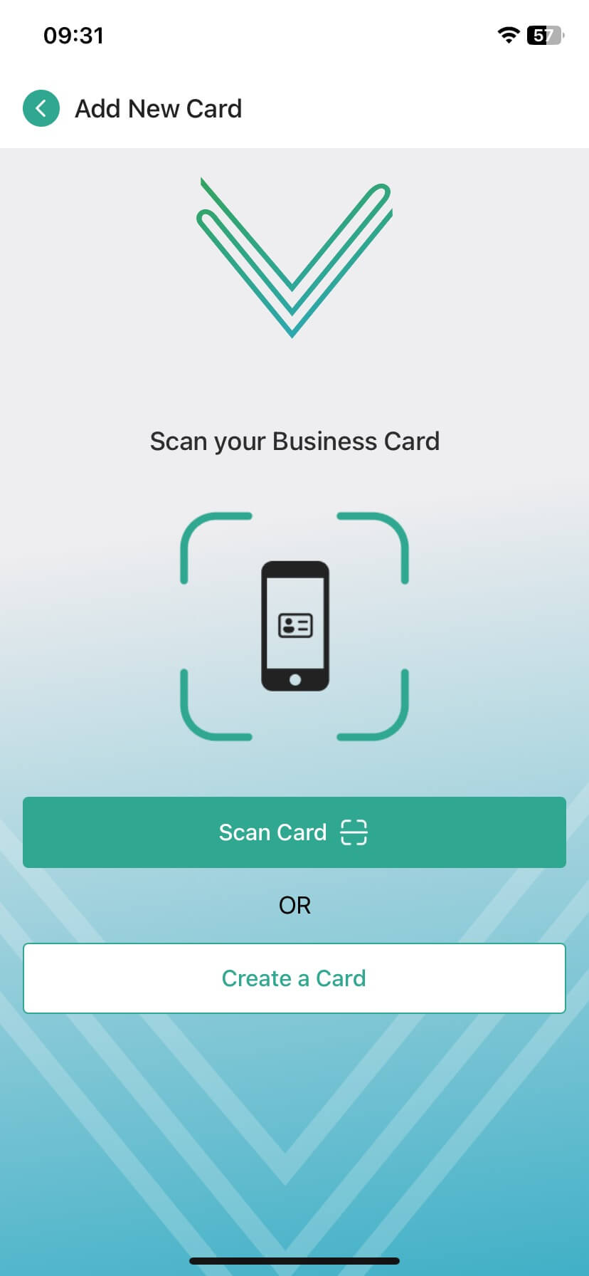 The user can clearly see my business card tab, after signing In. Users can either add a new business card by scanning the printed copy or create a new one from the options given.